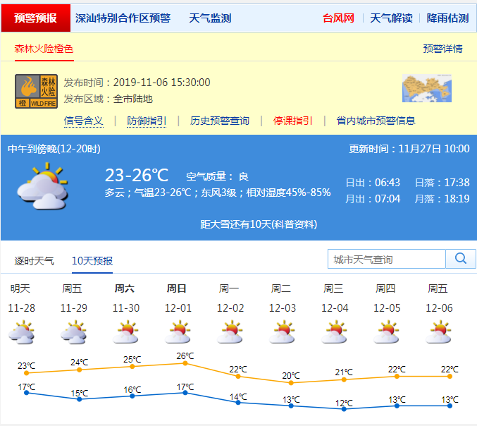 见圳客户端·深圳新闻网2019年11月27日讯 记者从市气象台获悉,27日夜间,新一股冷空气将开始影响深圳,预计11月28-29日空气持续干燥,早晚较凉,沿海、高地和海区阵风6-7级;30日-12月1日,气温略有回升。