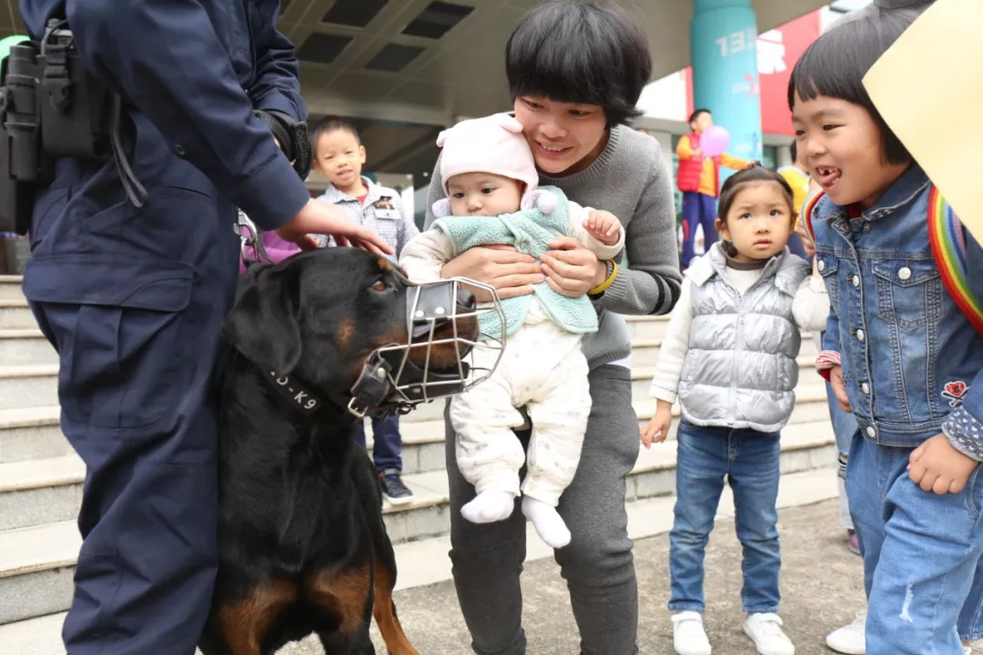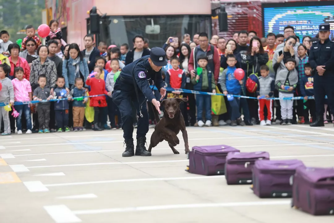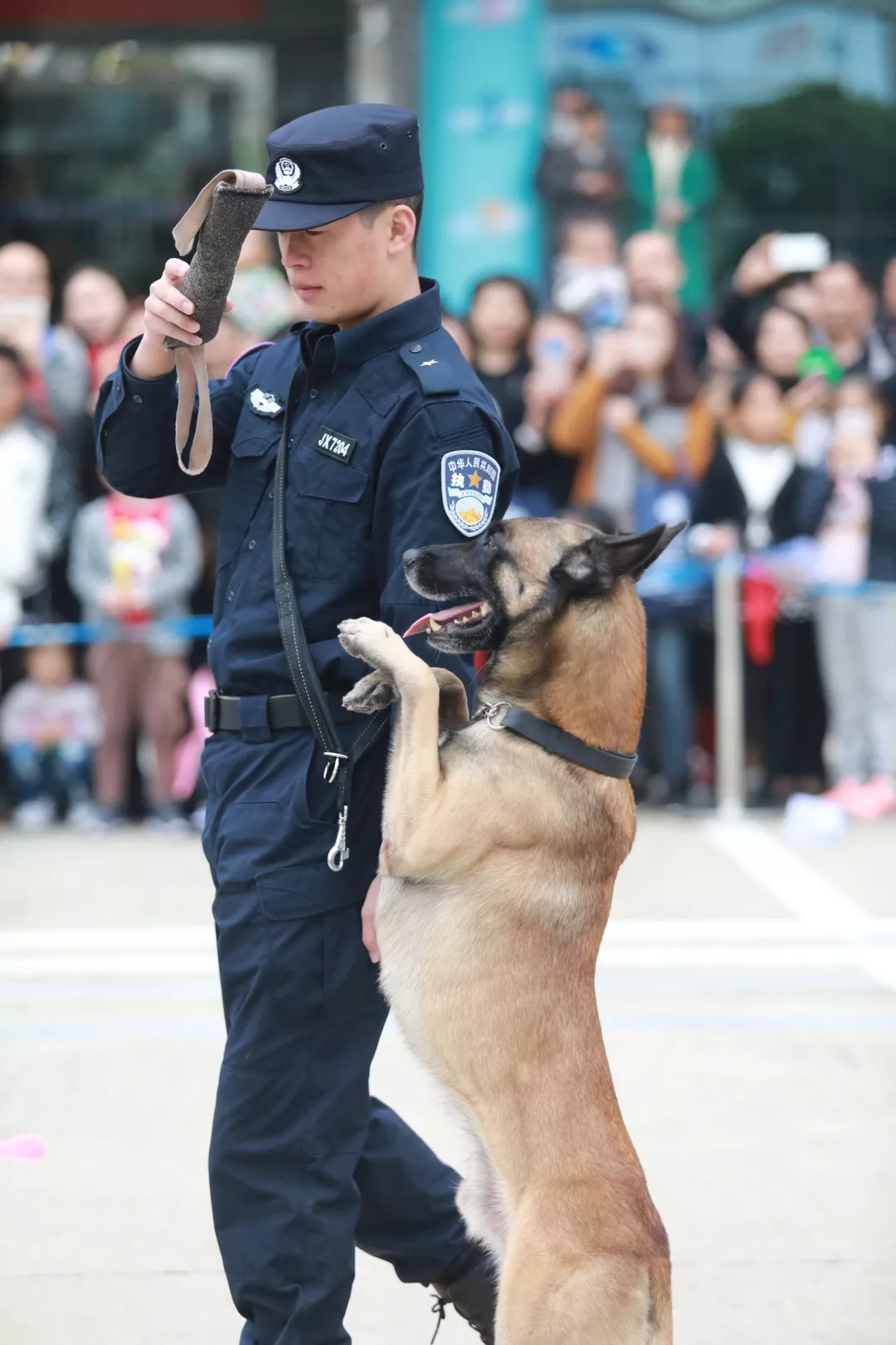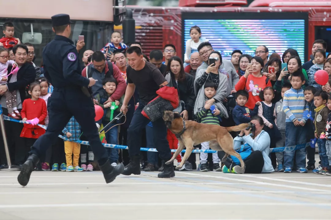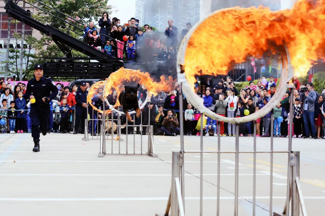 演出科目:跳跃人体障碍、实战扑咬、箱包搜索、解救人质、跳火圈等
