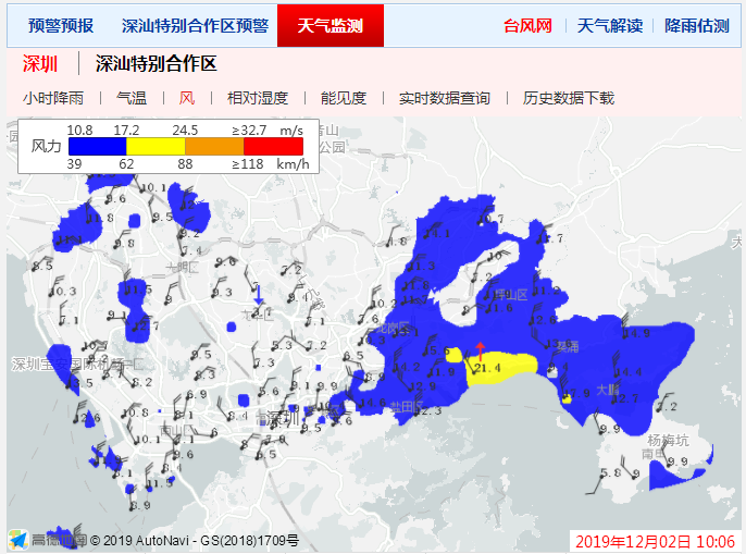 从实时的风力图上可以看到,龙岗区、坪山区、盐田区、大鹏新区大部风力在10.8m/s至17.2m/s,更有部分区域风力达黄色预警。