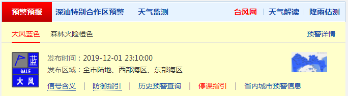 深圳市气象台于12月1日23时10分在全市发布大风蓝色预警,预计平均风力将达6级以上(或阵风8级以上),目前大风蓝色预警持续,今天东北风4-5级,沿海、高地和海区阵风7-8级。