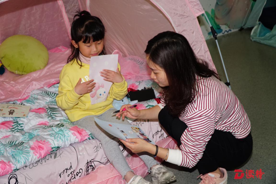 经过茶歇小憩之后,亲子游戏让孩子们乐不可支,在呼啦圈游戏中东穿西撞,在九宫格游戏中交朋结友,在去哪儿游戏里找不着北……这一晚的热烈在阅读推广人邓欢姐姐的晚安故事中沉淀下来,静下心来写下给未来自己的一封信。帐篷、星灯、绘本、游戏,给这30个亲子家庭营造了一个个奇妙的童话梦境。