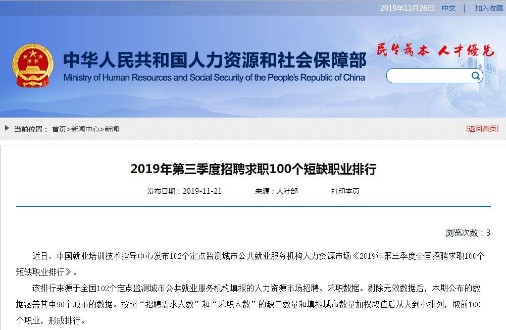 近日,中国就业培训技术指导中心发布102个定点监测城市公共就业服务机构人力资源市场《2019年第三季度全国招聘求职100个短缺职业排行》,这是国家层面首次汇总发布人力资源市场招聘求职短缺职业排行。