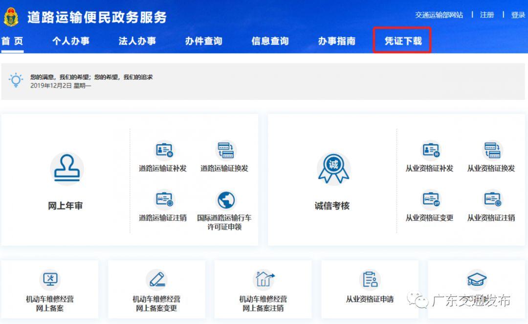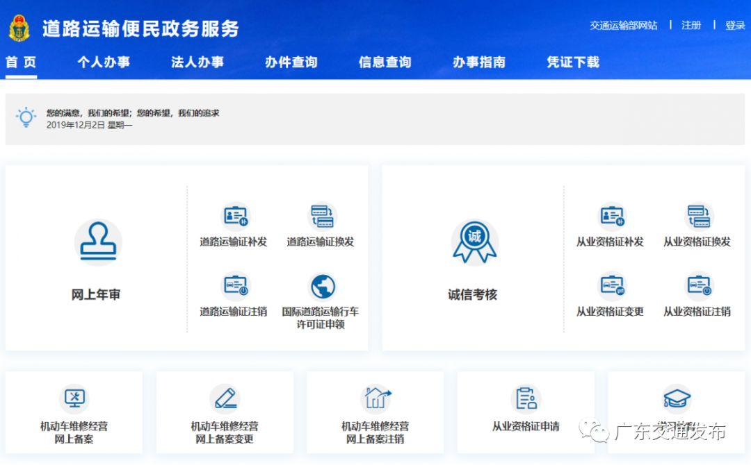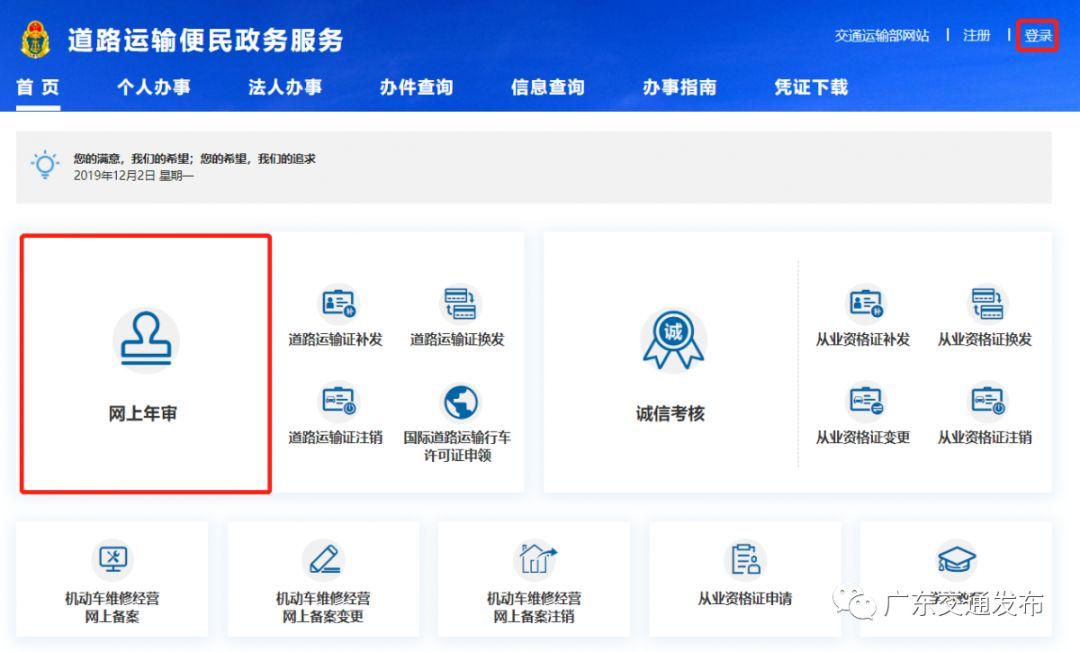 自2019年12月1日起,在全省正式实施普货车辆网上年审办理,货运经营者可选择“全国互联网道路运输便民政务服务系统”或“广东省道路运输企业服务平台”申办普货车辆年审业务。
