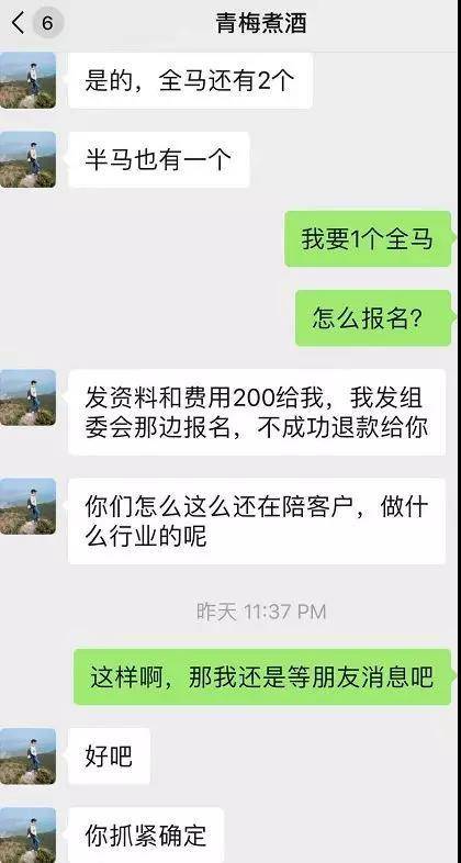 从文章中的聊天截图可见,有跑友向其询问如何报名深圳国际马拉松。“青梅煮酒”回复发个人资料和200元报名费,他会“发给组委会那边报名。”然而,在其收取钱款后,迅速将跑友拉黑了。