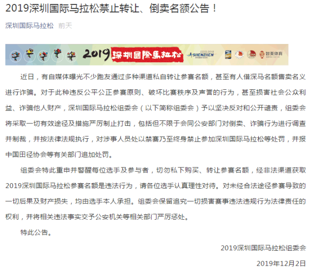 组委会重申,每位选手及参与者,切勿私下购买、转让参赛名额,经非法渠道获取2019深圳国际马拉松参赛名额是违法行为,请各位选手认真理性对待。对未经合法途径参赛导致的一切后果及财产损失,均由选手本人承担。