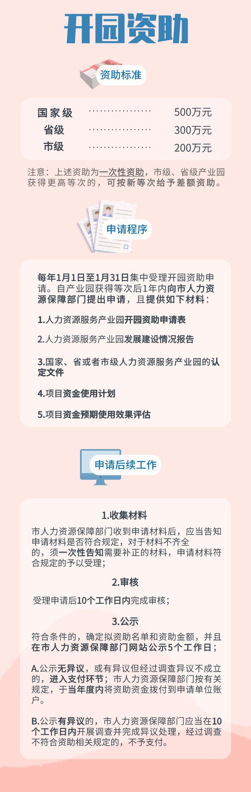 第六条 人力资源服务产业园获得国家级、省级、市级等次的,分别按照500万元、300万元、200万元的标准给予一次性开园资助。市级、省级产业园获得更高等次的,可按新等次给予差额资助。