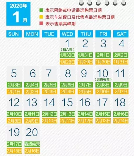 ①2020年春运从2020年1月10日持续至2月18日,按照铁路车票最长30天的预售期的安排,明天开始,铁路12306网站(含客户端)和95105105订票电话开始发售春运首日火车票。