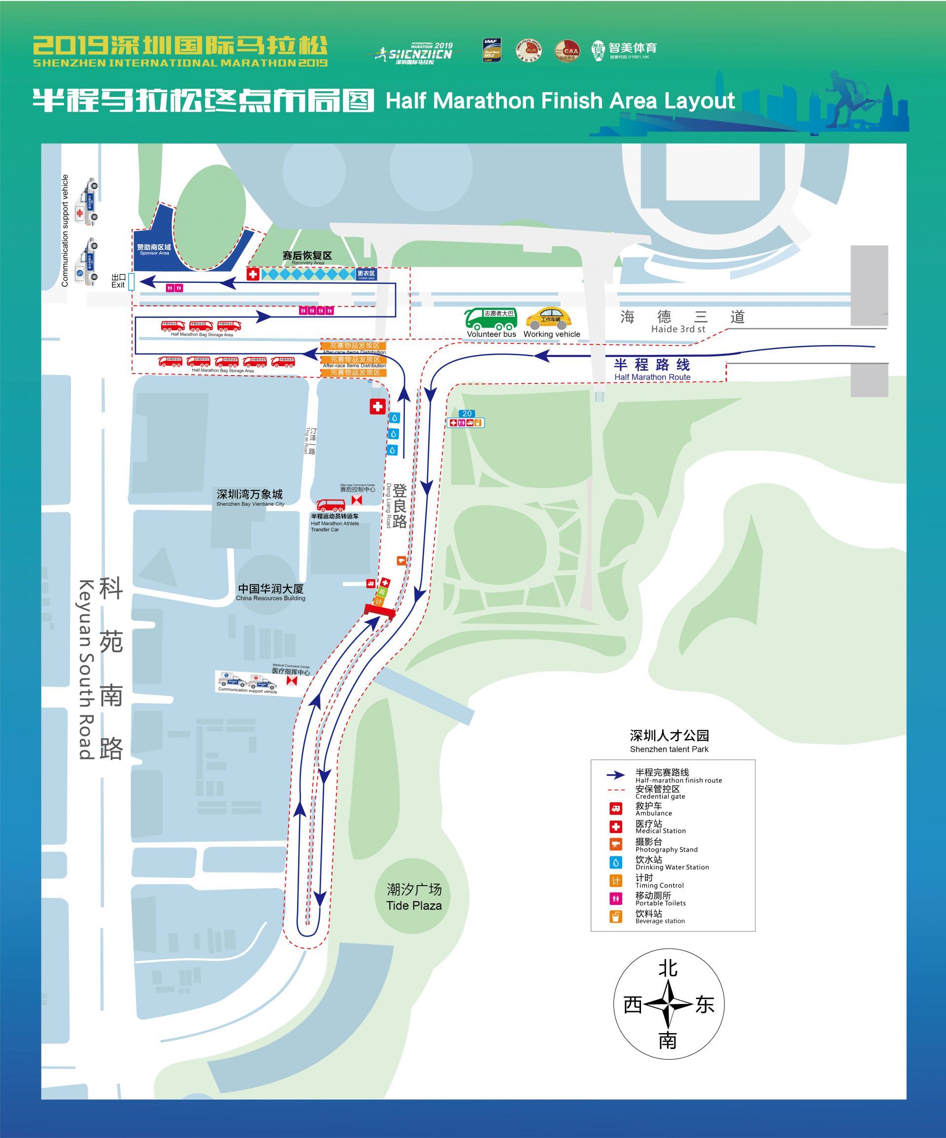 赛事基本情况基本与往年一致,全程马拉松终点这次与往年设在南山不同,是设在深南大道市民中心。