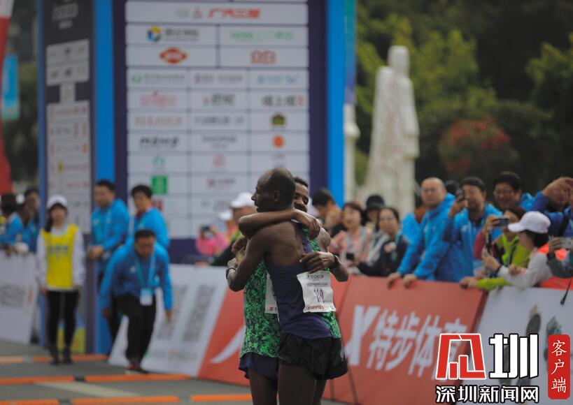 全程男子冠军Tadese Tola Woldegeberel和第二名获奖者拥抱。