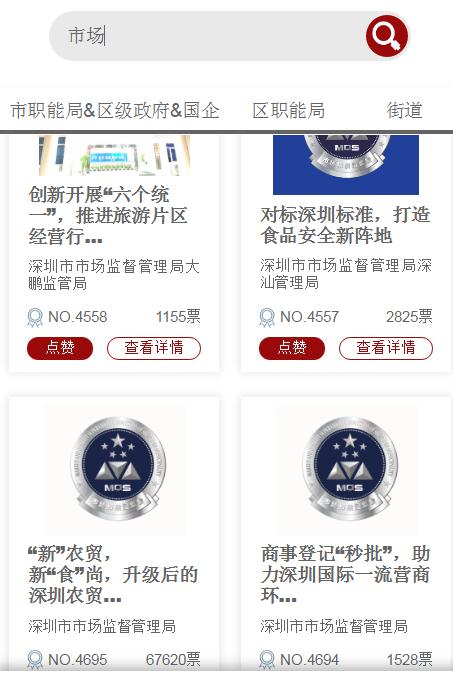 1、扫描识别上方二维码进入投票页面,在搜索栏输入关键词“市场”,即可找到深圳市市场监管局所有的入选民生实事(或对照上文表格中的编号输入,即可找到对应民生实事),点击“点赞”按钮,就可以为你心目中的民生实事投票啦!