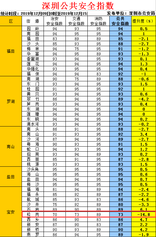 深圳公共安全指数发布 宝安区松岗街道73分全市倒数