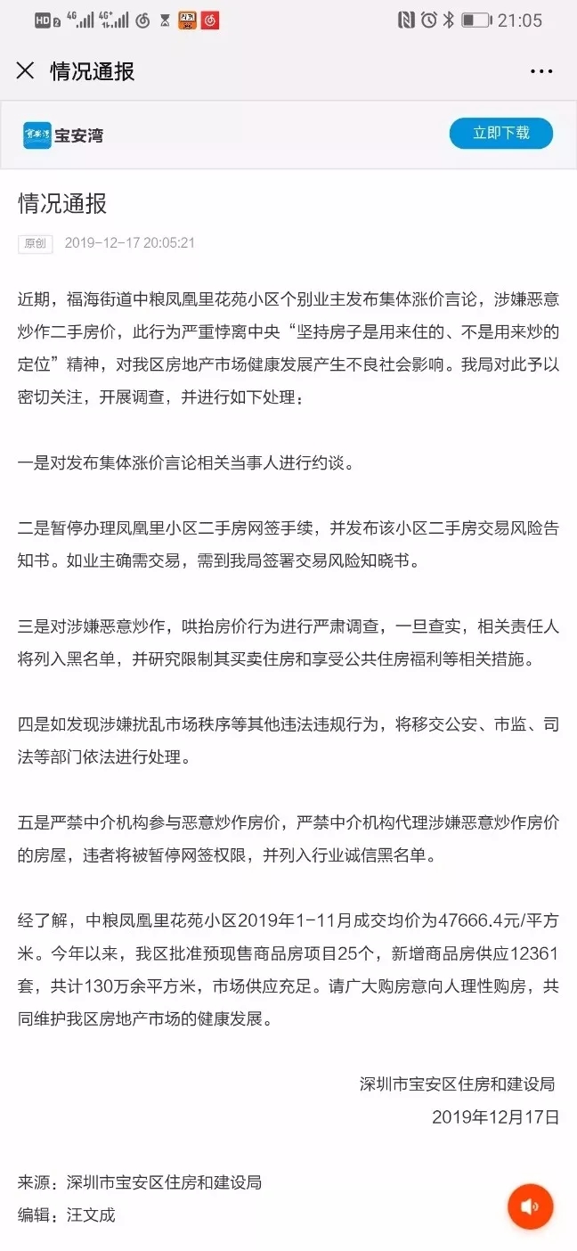 ⑧因近期福海街道中粮凤凰里花苑小区个别业主发布集体涨价言论,涉嫌恶意炒作二手房价,宝安住建局暂停中粮凤凰里花苑二手房网签。