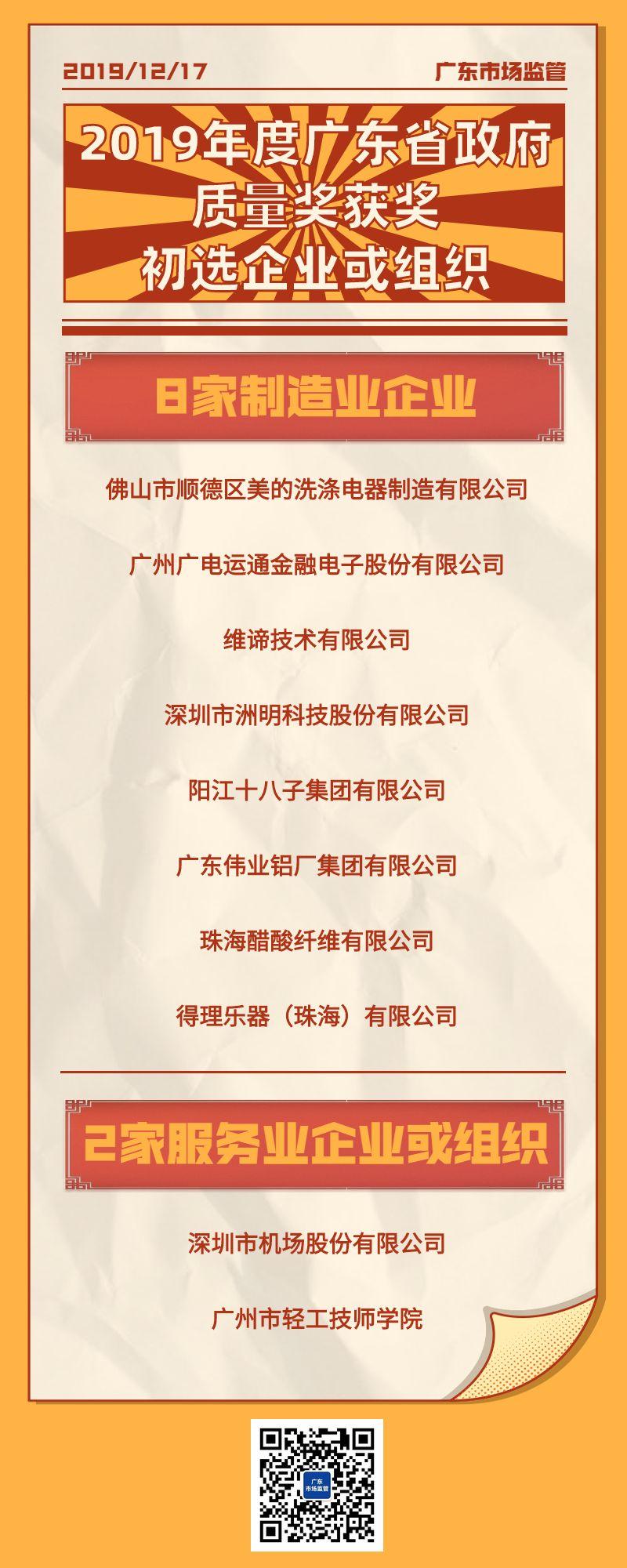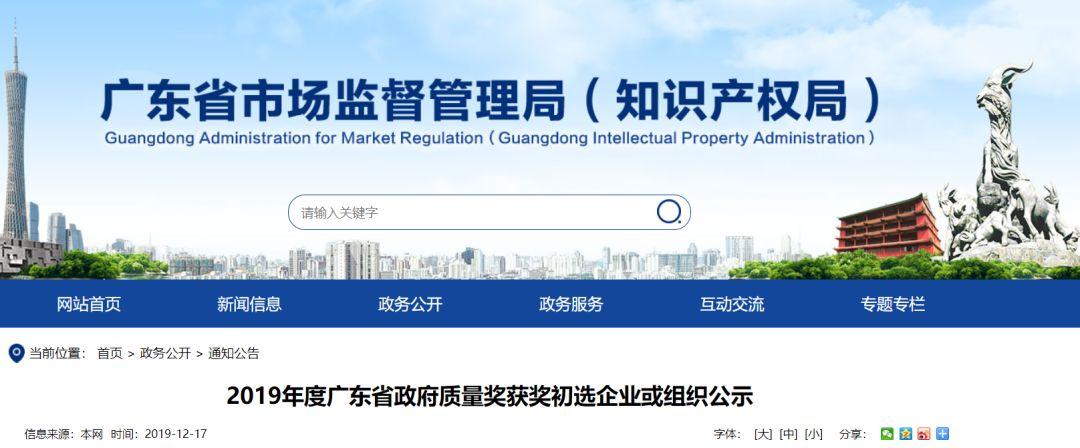 经2019年度广东省政府质量奖评审委员会审定2019年度广东省政府质量奖获奖初选企业或组织新!鲜!出!炉!啦