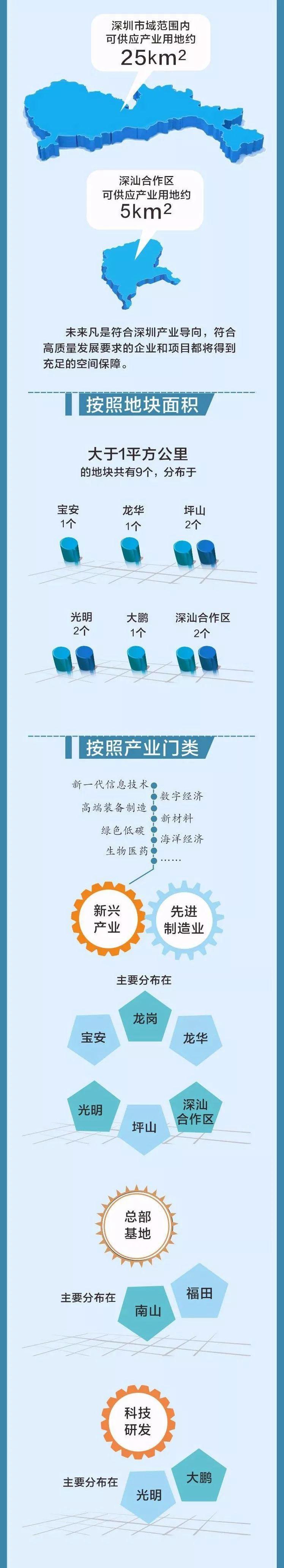 深圳向全球招商的30平方公里产业用地,集中在36个片区,其中深圳市域范围内可供应产业用地约25平方公里,深汕合作区可供应产业用地约5平方公里。上图中可以清楚看到,深圳几乎每个区都有地可用。