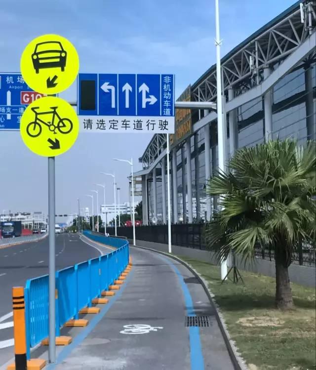 不仅标线是蓝的,连旁边的隔离护栏、头顶的标志牌也是通体的蓝色!