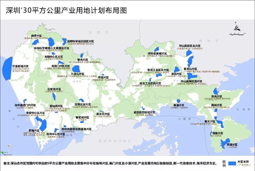 深圳向全球招商的30平方公里产业用地,集中在36个片区,其中深圳市域范围内可供应产业用地约25平方公里,深汕合作区可供应产业用地约5平方公里。上图中可以清楚看到,深圳几乎每个区都有地可用。