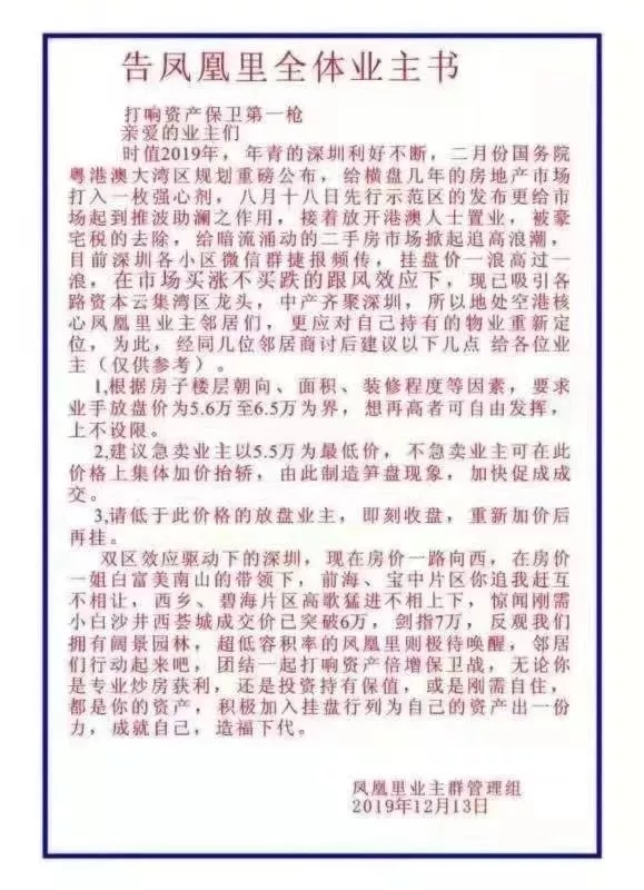 近日,福海街道中粮凤凰里花苑小区个别业主发布集体涨价言论,涉嫌恶意炒作二手房价,以下为网传业主倡议书