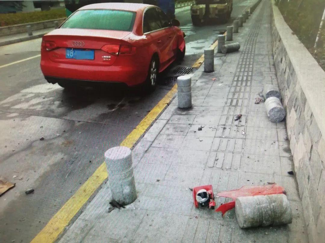 事故现场车辆破损,路边石桩被撞掉,现场一片狼藉