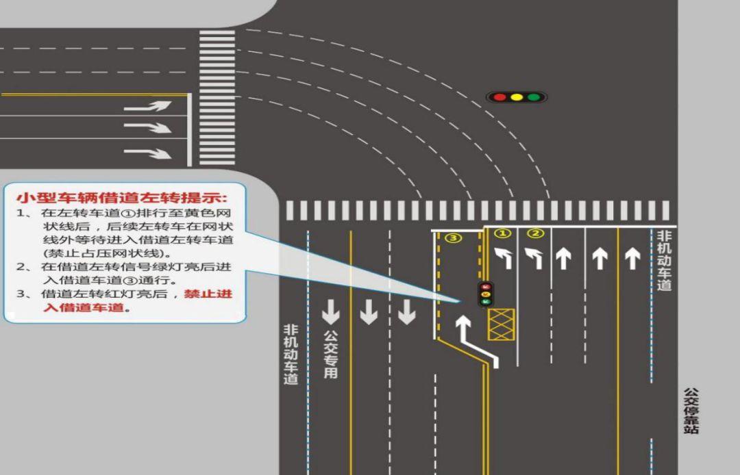 借道左转是指左转车辆借用对向车道来进行左转,其原理是利用交叉口的时间、空间关系,利用出口车道作为左转待转区。