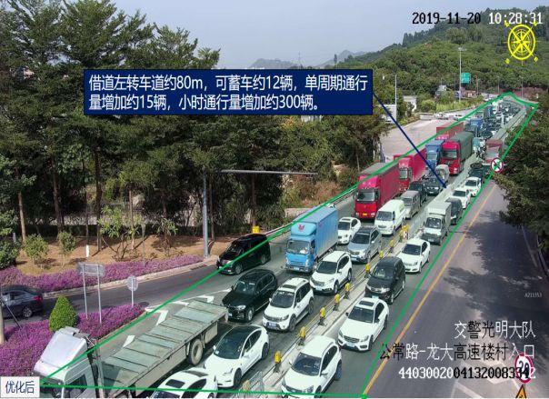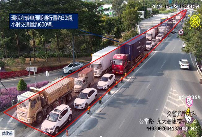实施借道左转方案前,北进口高峰单周期通行量约为30辆,小时通行量约为624辆,北进口通行压力大,通行效率较低。