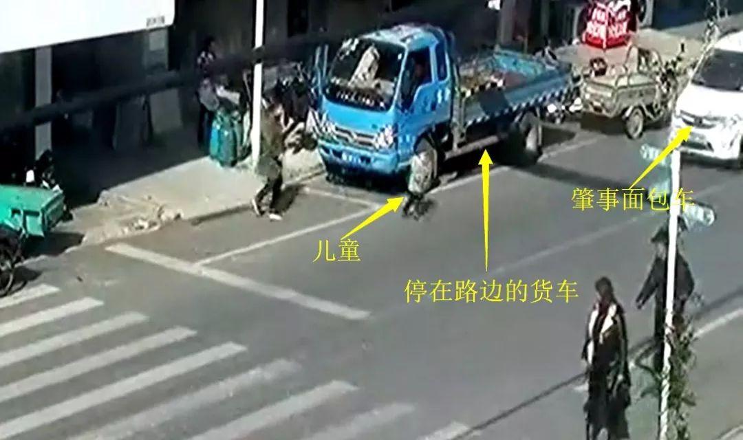如上面截图所示:路口附近停放了一辆货车,肇事面包车由货车后方驶来,直至儿童出现在货车车头左前侧,面包车驾驶人才有可能看到儿童的存在,而此时货车已行至图中所在的位置。