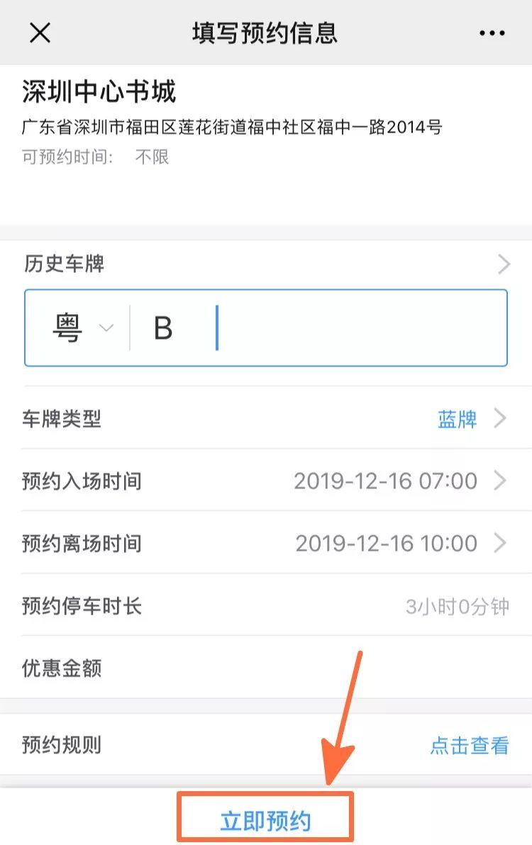 输入车牌信息和手机号码,点击“立即预约”,车位就预约成功啦。要记住哦,不通过预约软件自行进入配套停车场的用户及非就诊用户,不享受费用减免政策。