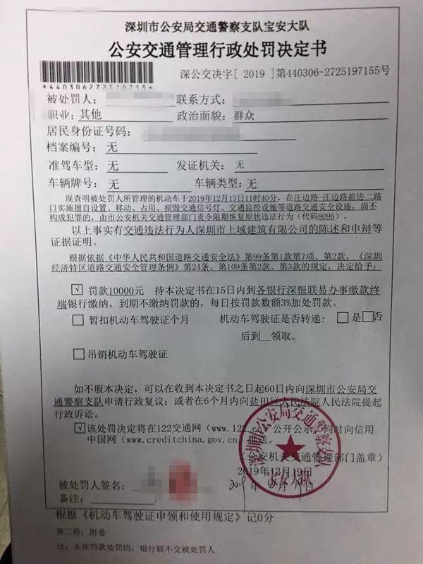 深圳交警现场对占道施工单位开具处罚通知书,处以罚款10000元,并依法对施工现场负责人处以3日的行政拘留处罚。