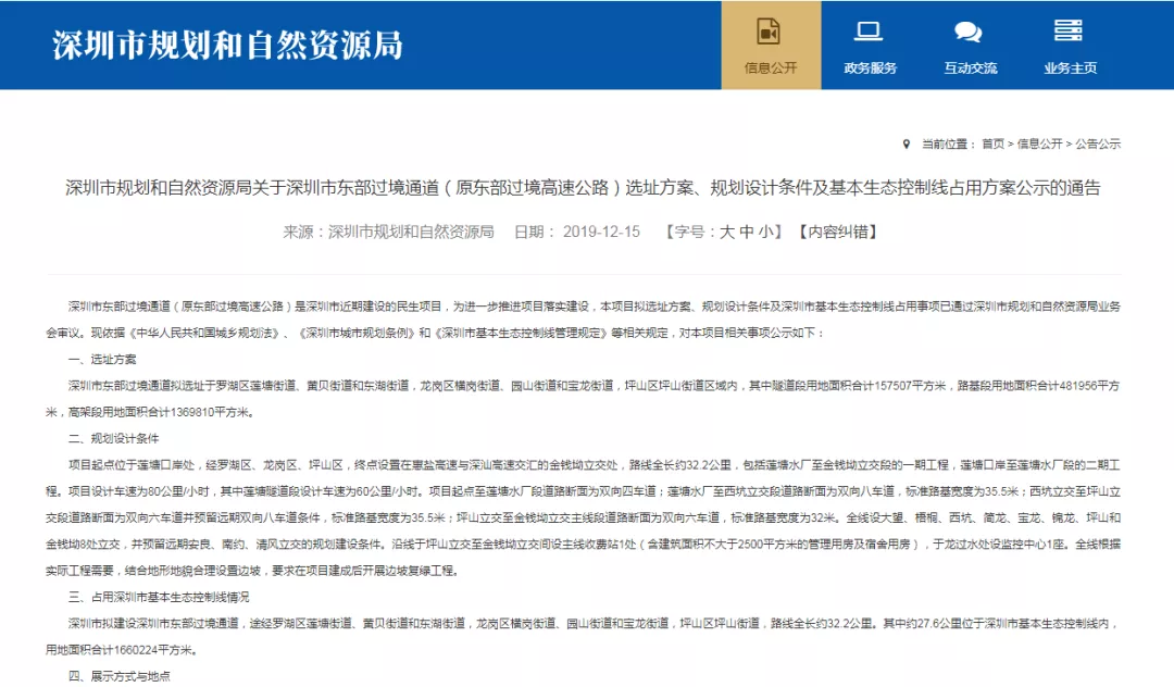近日,深圳市规划和自然资源局公示东部过境通道选址方案、规划设计条件及基本生态控制线占用方案的通告,于2020年1月13日前向社会征求意见。