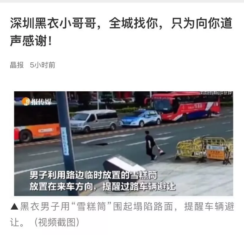 5月16日傍晚时分,一名身穿黑衣的青年男子经过南山海德一路和后海滨路交汇处时发现路面有塌陷并出现不小的洞口,车辆擦边迅疾而过险象环生,于是从路边找来若干雪糕筒摆在洞口来车方向提醒司机绕洞而行,从而避免了交通事故的发生。