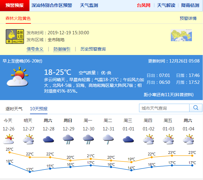 见圳客户端·深圳新闻网2019年12月26日讯 今日白天多云,气温18-25℃,明天傍晚至27日受冷空气影响,北风加大,沿海、高地和海区最大阵风7级左右,气温下降4-5℃,天气转凉。28日多云,29-30日有一次明显降雨过程。