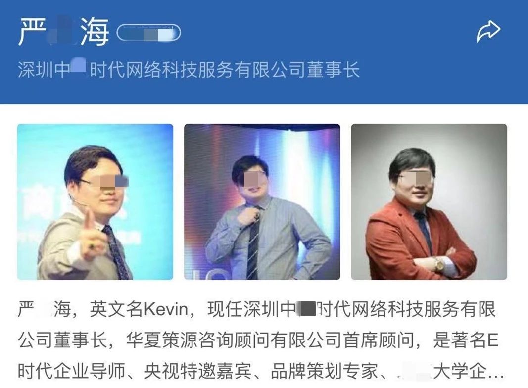 据介绍,董事长“严某海”对外宣传资料显示:著名E时代企业导师、品牌策划专家、某知名大学企业转型升级总裁班实践导师,担任过多家知名企业的顾问。据被抓获的团伙成员交代,严某海自称拥有双硕士学历,是香港大学学者,还是牛津大学博士。