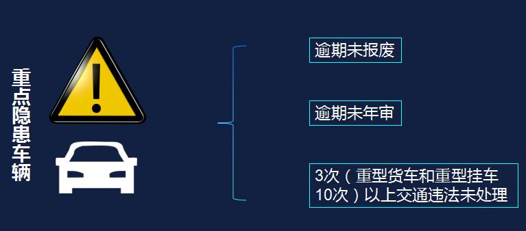 车辆状态为逾期未报废、逾期未年审以及3次(重型货车和重型挂车10次)以上交通违法未处理的重点车辆。
