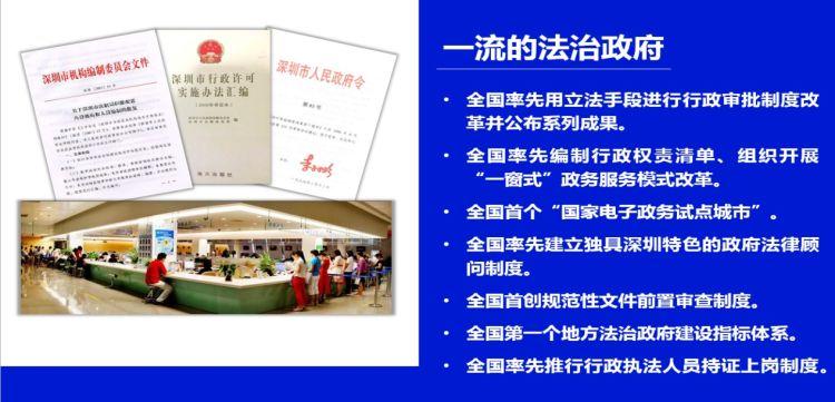 努力规范政府与市场边界,建设最公开透明、最廉洁高效的法治政府。一流的营商环境离不开一流的法治政府,深圳法治政府建设一直走在全国前列。自2013年广东省政府依法行政考评启动以来,深圳连续五年被评为优秀等次。2017年至2018年,深圳市两度获评“全国法治政府建设典范城市”荣誉。在中国政法大学组织的2018年度中国法治政府评估中,深圳市位列100个参与评估城市第一名。