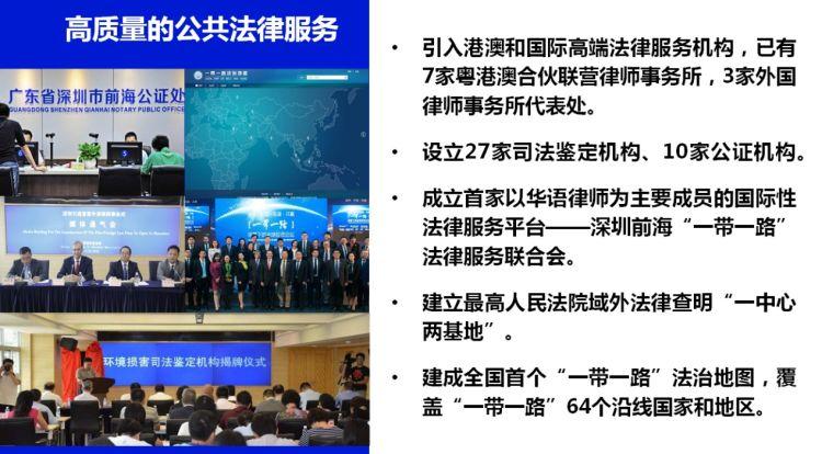 建立完备的公共法律服务体系,助力法治化营商环境建设。深圳积极整合律师、公证、司法鉴定、调解等法律服务资源,建设覆盖全业务、全时空的法律服务网络,逐步形成覆盖全市、普惠均等、便捷高效、智能精准的现代公共法律服务体系,努力打造法律服务枢纽城市,为法治社会建设奠定坚实基础,助力法治化营商环境建设。