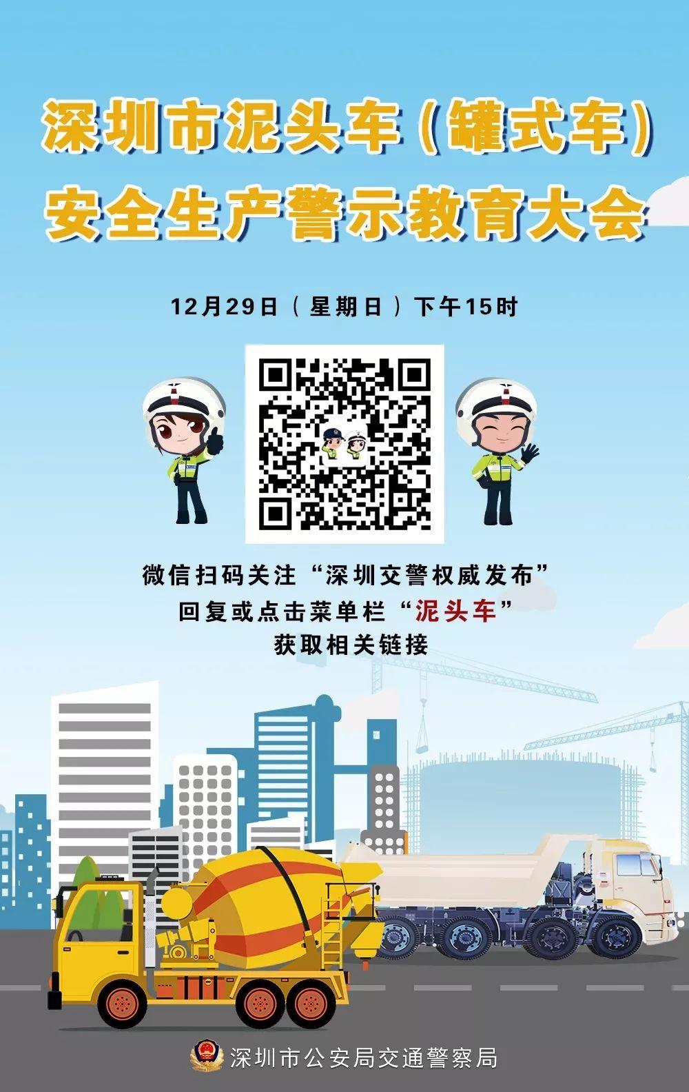 为进一步加强泥头车、搅拌车交通安全管理工作,强化行业从业人员、全体驾驶员的安全教育,深圳交警定于12月29日(星期日)召开泥头车(罐式车)安全生产警示教育会议。