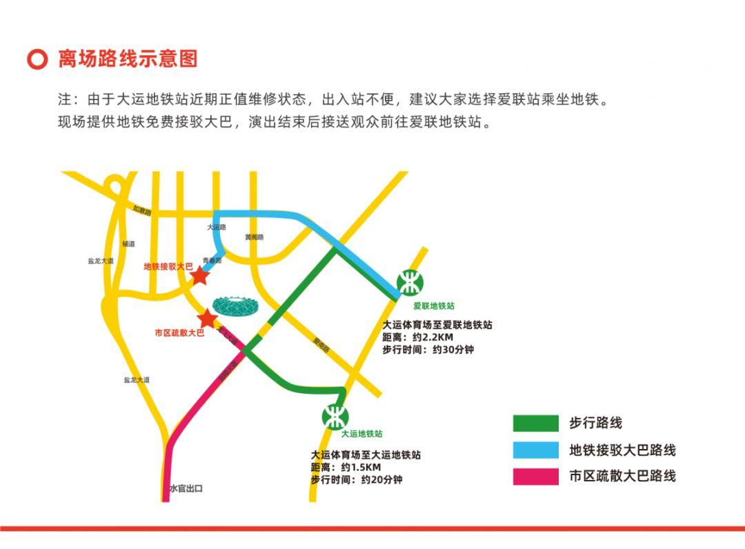 龙飞大道内场D通道,具体上车点请看场馆周边指示、人员指引及现场广播提示等。观众可在指定停车点依次上车,大巴客满即走。