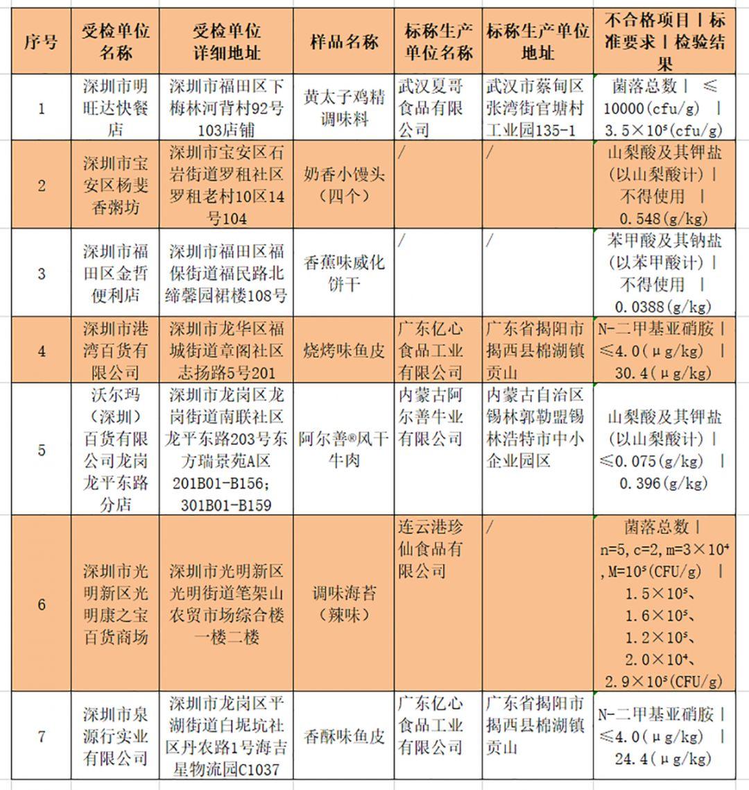 本次共抽检流通、餐饮环节食品844批次,涉及流通、餐饮环节经营主体256家次,共检测食品指标6187项次。其中检出不合格样品7批次,涉及不合格食品类别有饼干1批次,餐饮食品1批次,肉制品1批次,水产制品3批次,调味品1批次;涉及不合格项目类别为微生物污染、食品添加剂、其他污染物。