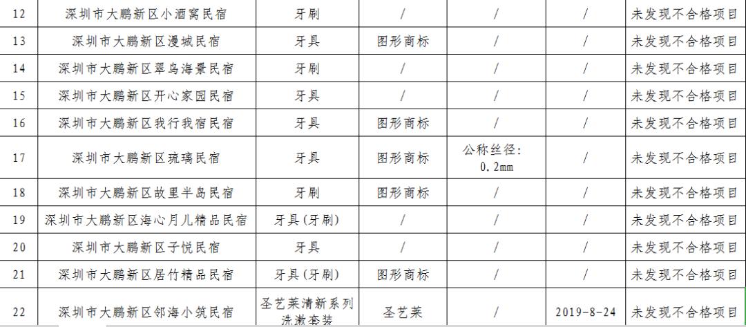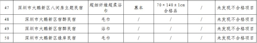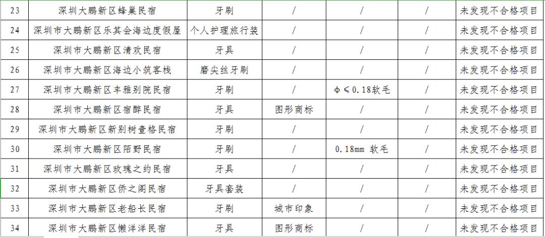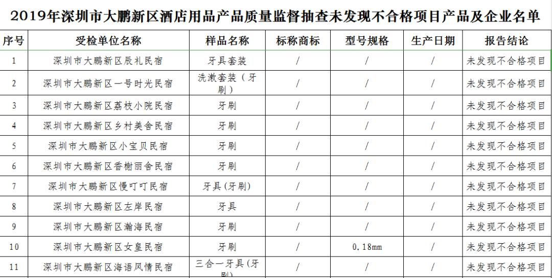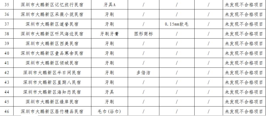 本次监督抽查对大鹏新区酒店用品牙刷的卫生要求和安全要求项目,毛巾的甲醛含量、耐水色牢度等项目进行了检测。共抽查了46家酒店的50批次产品,合格产品50批次,合格率100%。