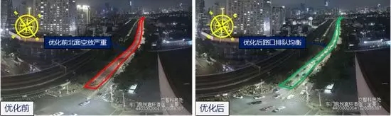 根据该路口车流量和人流量的时段变化特点,蜀黍将夜间信号灯周期进行压缩,从155秒缩短至145秒。优化后,减少路口空放现象减少,行人过街等待时间减少,过街体验明显提升。