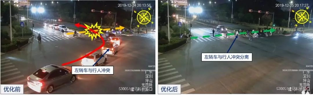 优化改善后,路口夜间周期由102秒下降至87秒,路口空放明显减少;人、车交叉冲突点数由2个减少至0个,基本实现人车独立通行路权,行人过街安全得以保障。
