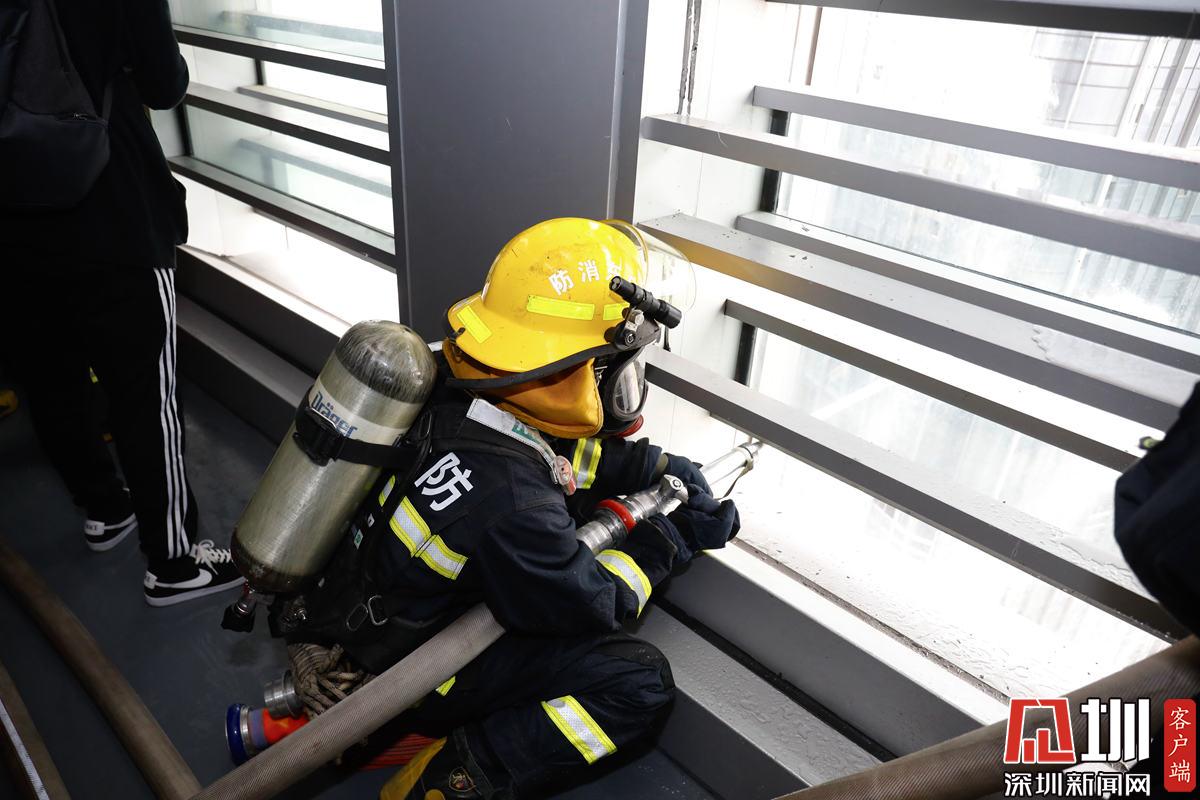 演练开始后,模拟中国华润大厦24层因电气线路发生短路,突发火灾,火势迅速蔓延。此时正值上班高峰期,楼内有大量办公人员需要疏散救助,情况十分紧急。“火灾”警报拉响后,大楼内部的微型消防站和技术处置队进行先期处置。深圳市消防救援支队同时快速调派特勤、南山、宝安、福田等大队48辆消防车、230余名消防员到场处置,并联动应急管理、交警、医疗、水务等部门到场协同处置。消防救援人员“逆行”深入起火建筑,疏散楼内5200余名群众,同时按照“以固为主,固移结合”的战术,利用水枪、水泡、灭火机器人、灭火无人机、举高消防车、投弹式高层建筑干粉消防车等压制火势,最终成功将“大火”扑灭。