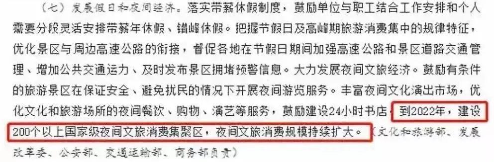 8月,国务院办公厅印发《关于进一步激发文化和旅游消费潜力的意见》中明确提出大力发展夜间文旅经济,提出了9项激发文化和旅游消费潜力的政策举措。其中包括“鼓励有条件的旅游景区在保证安全、避免扰民的情况下开展夜间游览服务。丰富夜间文化演出市场,优化文化和旅游场所的夜间餐饮、购物、演艺等服务,鼓励建设24小时书店。到2022年,建设200个以上国家级夜间文旅消费集聚区,夜间文旅消费规模持续扩大。”