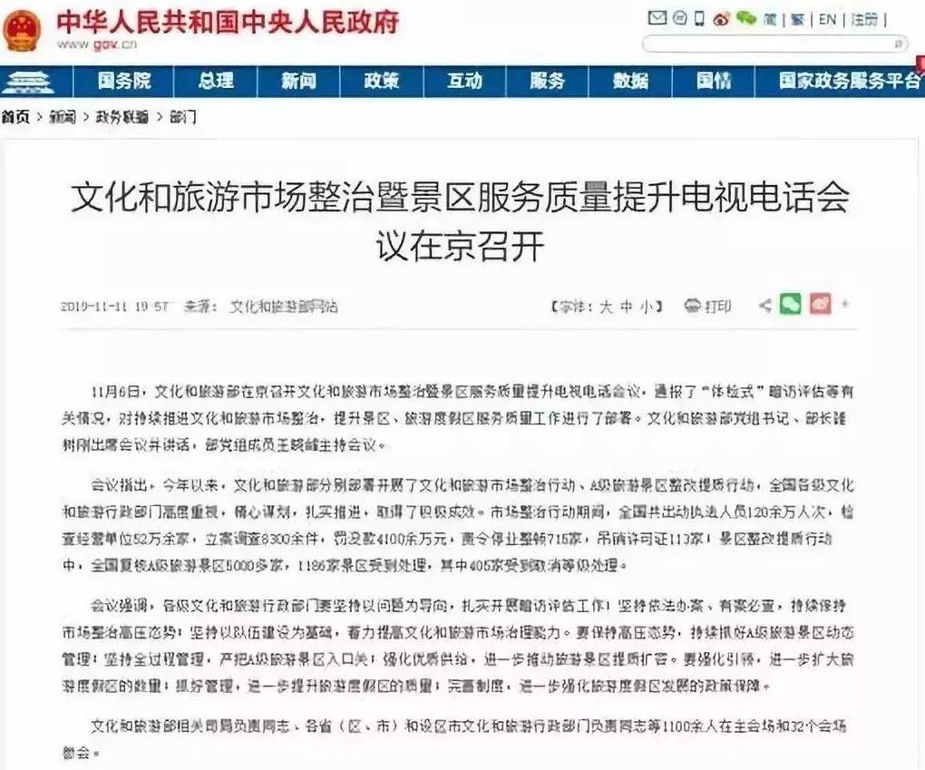 2019年11月,文化和旅游部召开文化和旅游市场整治暨景区服务质量提升电视电话会议。会议通报,在2019年的A级旅游景区整改提质行动中,全国复核A级旅游景区5000多家,1186家景区受到处理,其中405家受到取消等级处理。可以说是历年来整治力度最大的一次。