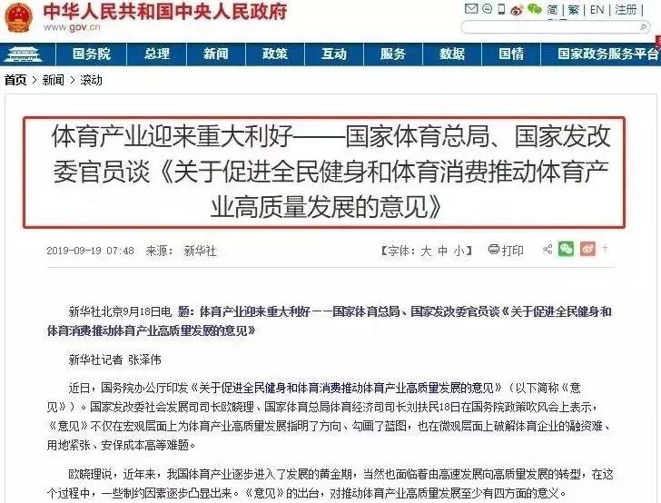2019年9月11日,国务院办公厅印发《关于促进全民健身和体育消费推动体育产业高质量发展的意见》,提出了10个方面政策举措,实施“体育+”行动,促进“体育+旅游”融合发展,鼓励建设体育服务综合体、运动休闲特色小镇。进一步推动“文体旅”的融合和发展。