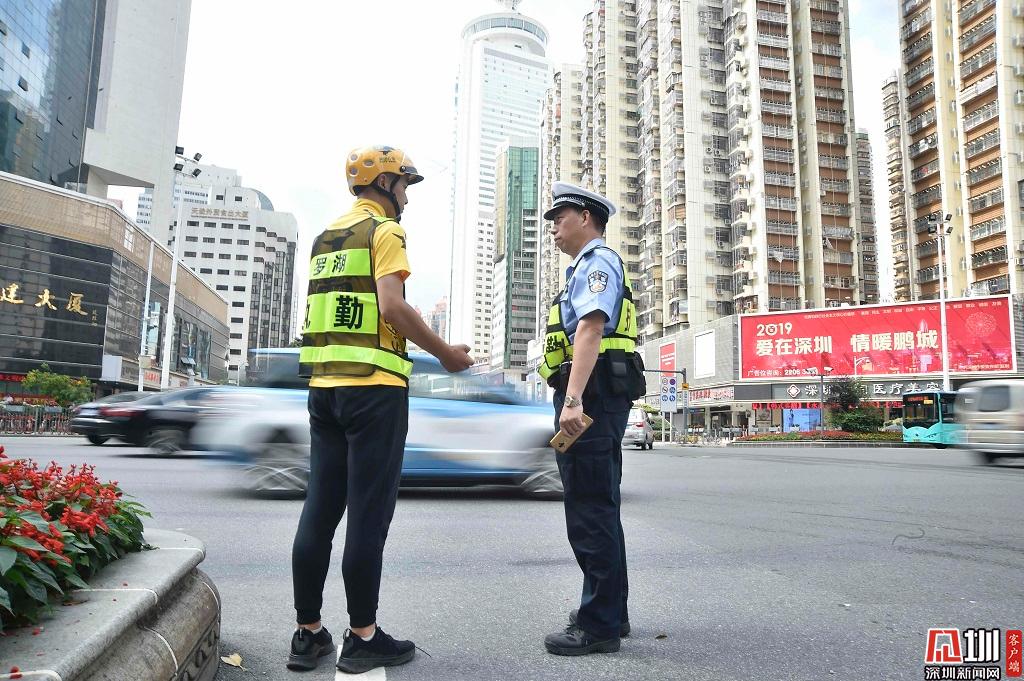 2019年4月23日,深南东路,深圳交警开展和外卖小哥角色互换的活动,美团外卖小哥赵春晓正在路口执勤。