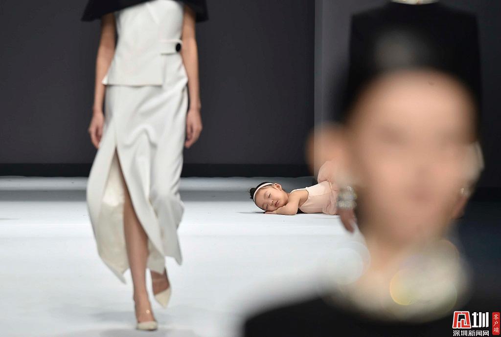 2019年3月14日,深圳时装周首秀,一位在T台上睡着的小女孩。