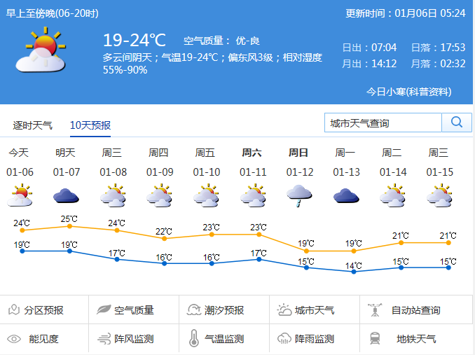 见圳客户端·深圳新闻网2020年1月6日讯 据深圳市气象台消息,预计本周初深圳多云间阴天,早晚有零星小雨和轻雾;周三至周四受弱冷空气影响,沿海和高地阵风6~7级,早晚清凉;周五至周六多云,气温回升,周日受冷空气影响,气温再次下降。