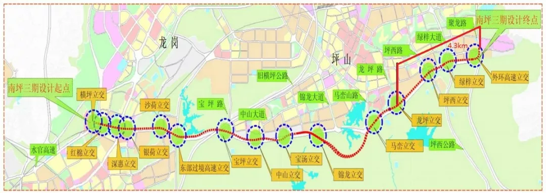 至于沿线立交方面,沿线龙岗大道立交、东部过境立交、中山立交、龙坪立交已开通。坪西立交计划近期开通。