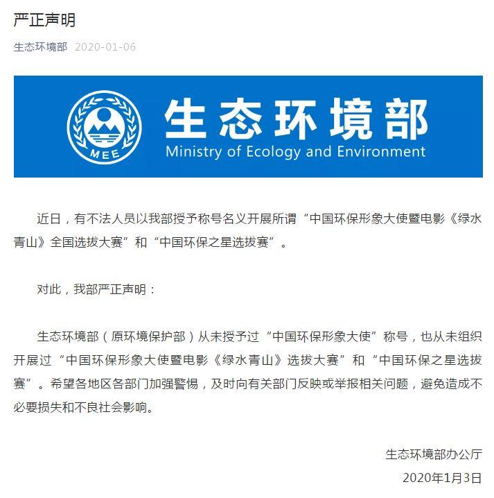 对此,生态环境部发表严正声明指出,生态环境部(原环境保护部)从未授予过“中国环保形象大使”称号,也从未组织开展过“中国环保形象大使暨电影《绿水青山》选拔大赛”和“中国环保之星选拔赛”。