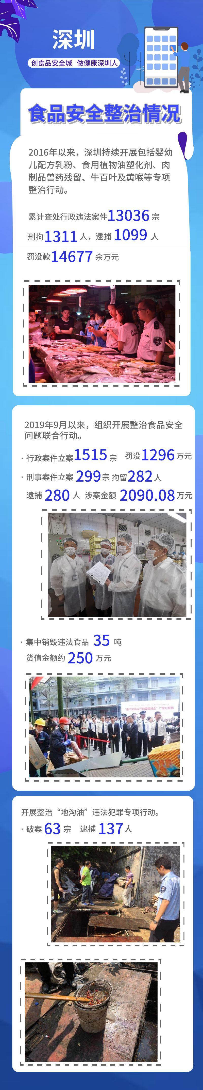 2019年9月以来,全力组织开展整治食品安全问题联合行动,聚焦“黑工厂”“黑作坊”“黑窝点”、保健食品虚假宣传和违规销售、学校食品安全主体责任不落实、农产品质量安全和农药兽药添加禁用成分四大整治重点,结合深圳实际,深挖出八大类严重侵害群众利益的突出问题,包括私宰畜禽产品与活禽非法交易、水果蔬菜等农产品农药残留、贝类水产品兽药残留及添加禁用物质、校园食品安全及“三无”食品、保健食品非法添加及虚假宣传、牛百叶及火锅店问题、食品安全潜规则隐患、餐饮业质量安全问题,印发专门工作方案,组织教育、公安等部门和各区加大力度查处。通过集中整治,查处了一批伪劣假冒产品,破获生石灰漂白牛肚流入餐饮店、假冒贵州茅台酒、小罐茶、香港知名品牌月饼等典型案件,行政案件立案1515宗,罚没1296万元,刑事案件立案229宗,拘留282人,逮捕280人,涉案金额2090.08万元,集中销毁未经检验检疫的冻肉、假冒品牌月饼、假冒伪劣洋酒、无合法来源公仔面、山寨粤盐、抽检不合格的大米和调味料、伪劣茶叶等违法食品35吨,货值金额约250万元,让市民群众感受到实实在在的整治成效。
